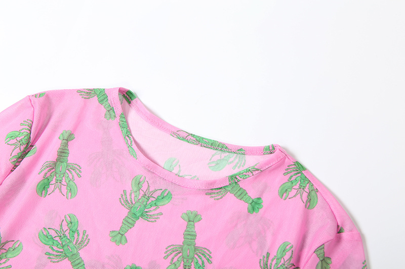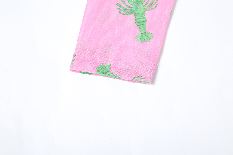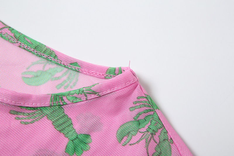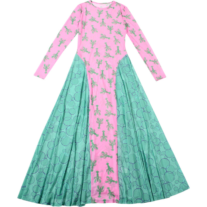 Autumn Retro Women Mesh round Neck Contrast Color Loose Waist Controlled Long Sleeves Printing Dress