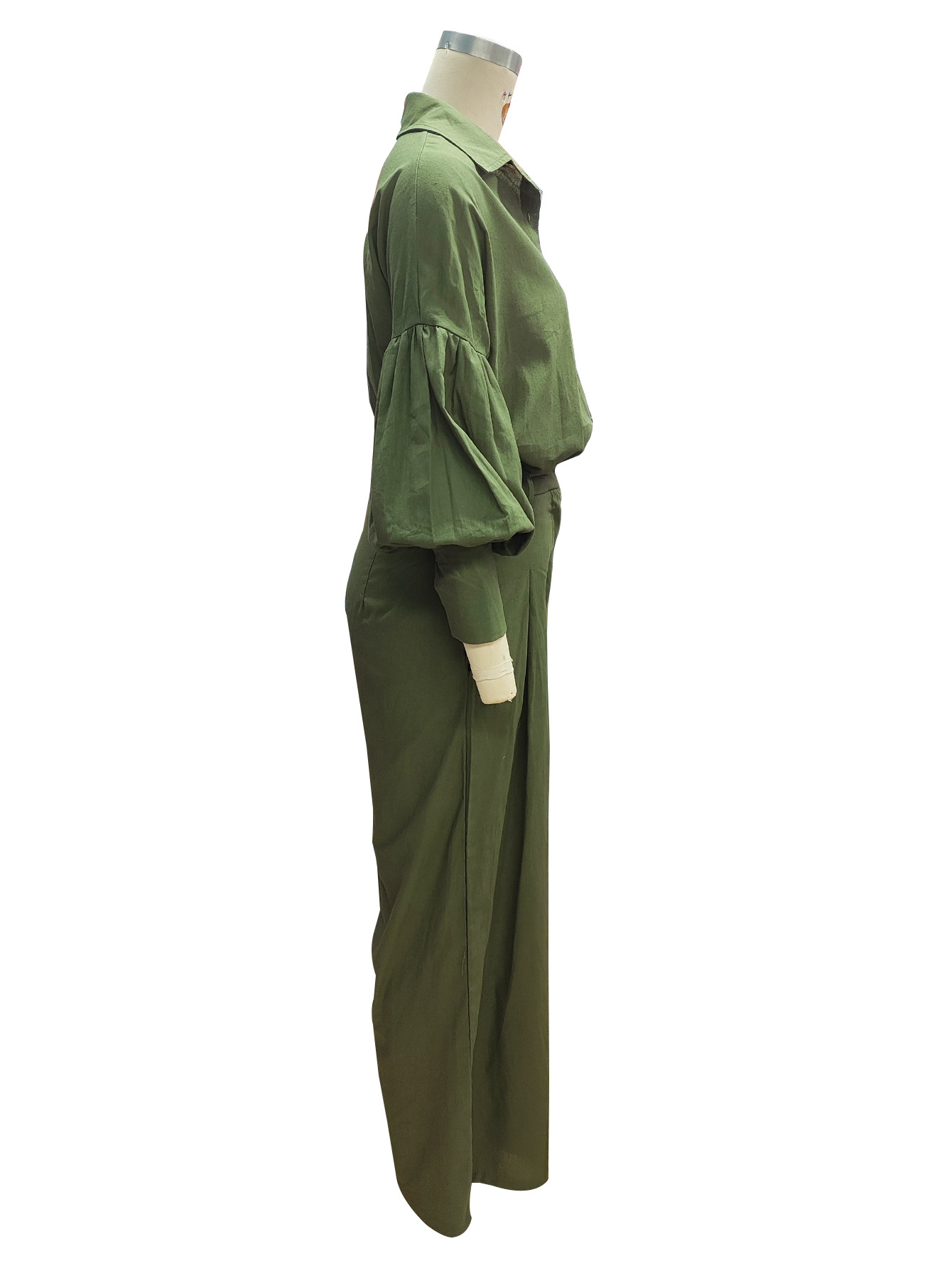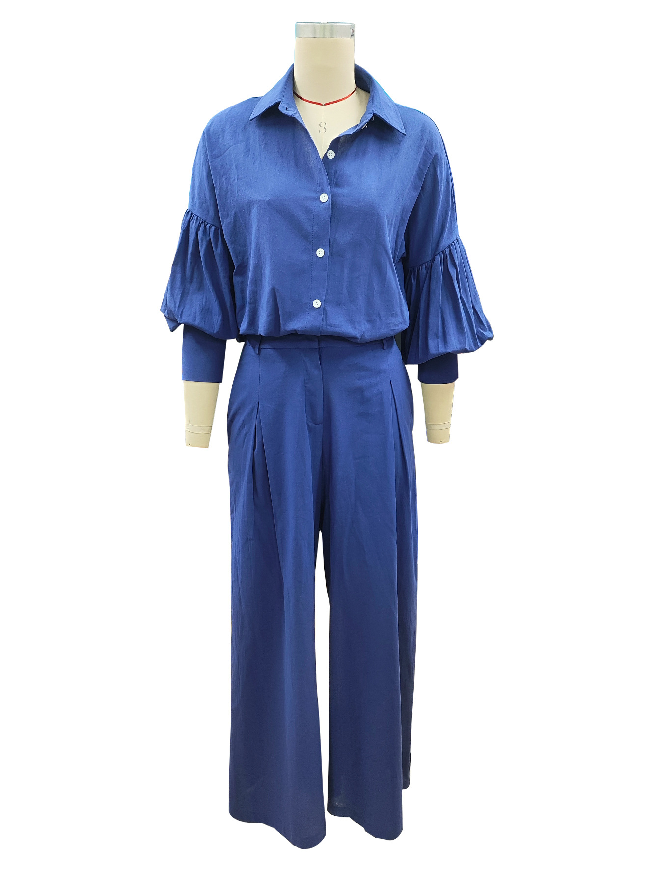 Autumn Solid Color Long Sleeved Shirt Wide Leg Pants Cotton Linen Two Piece Sets