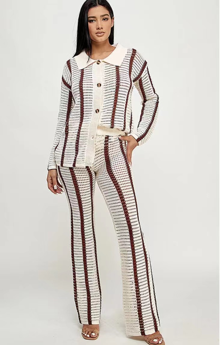 Autumn Sweet Casual Striped Hollow Out Cutout Knitted Cardigan Women Coat Long Sleeve Length Straight Leg Pants Sets