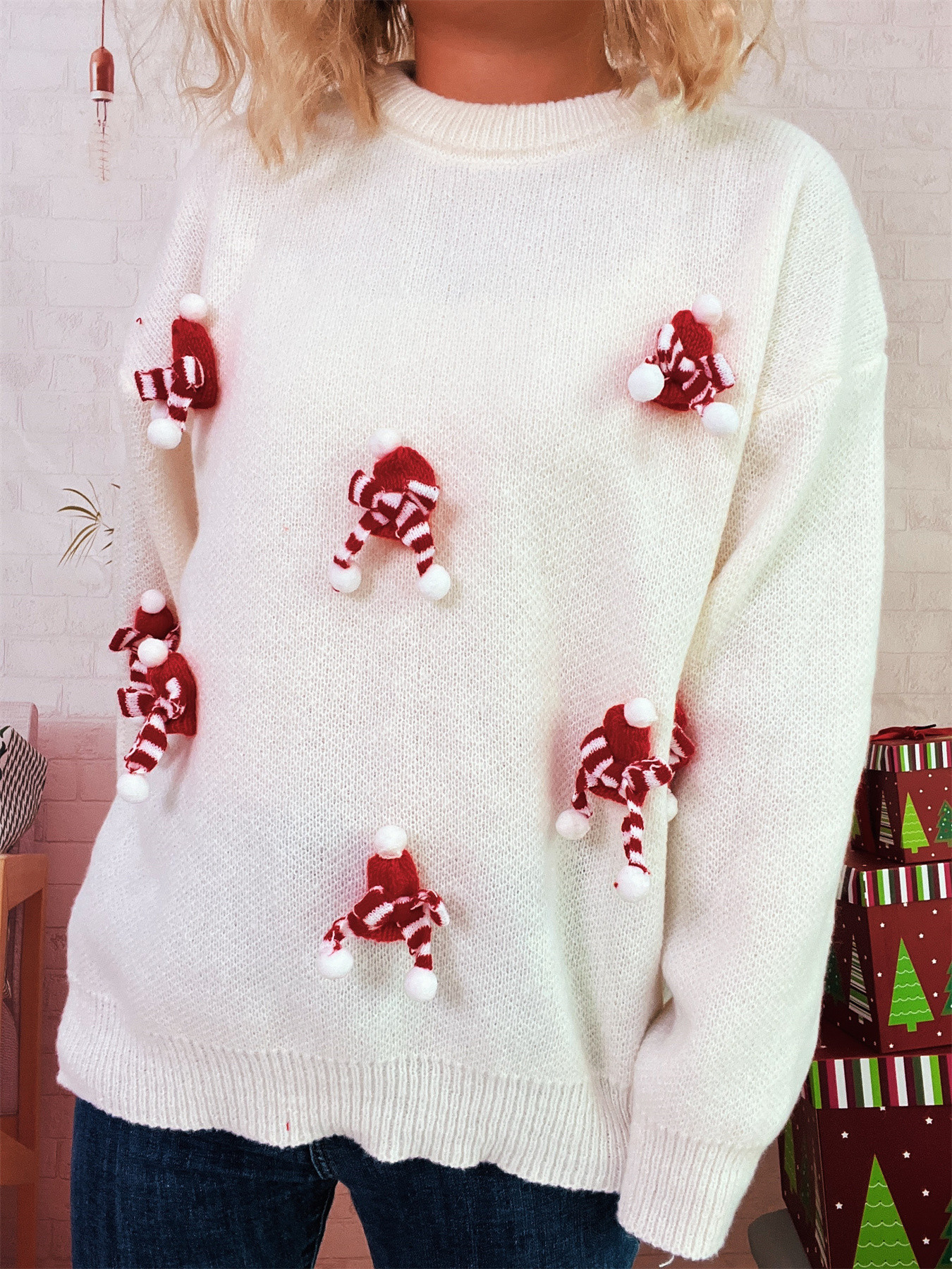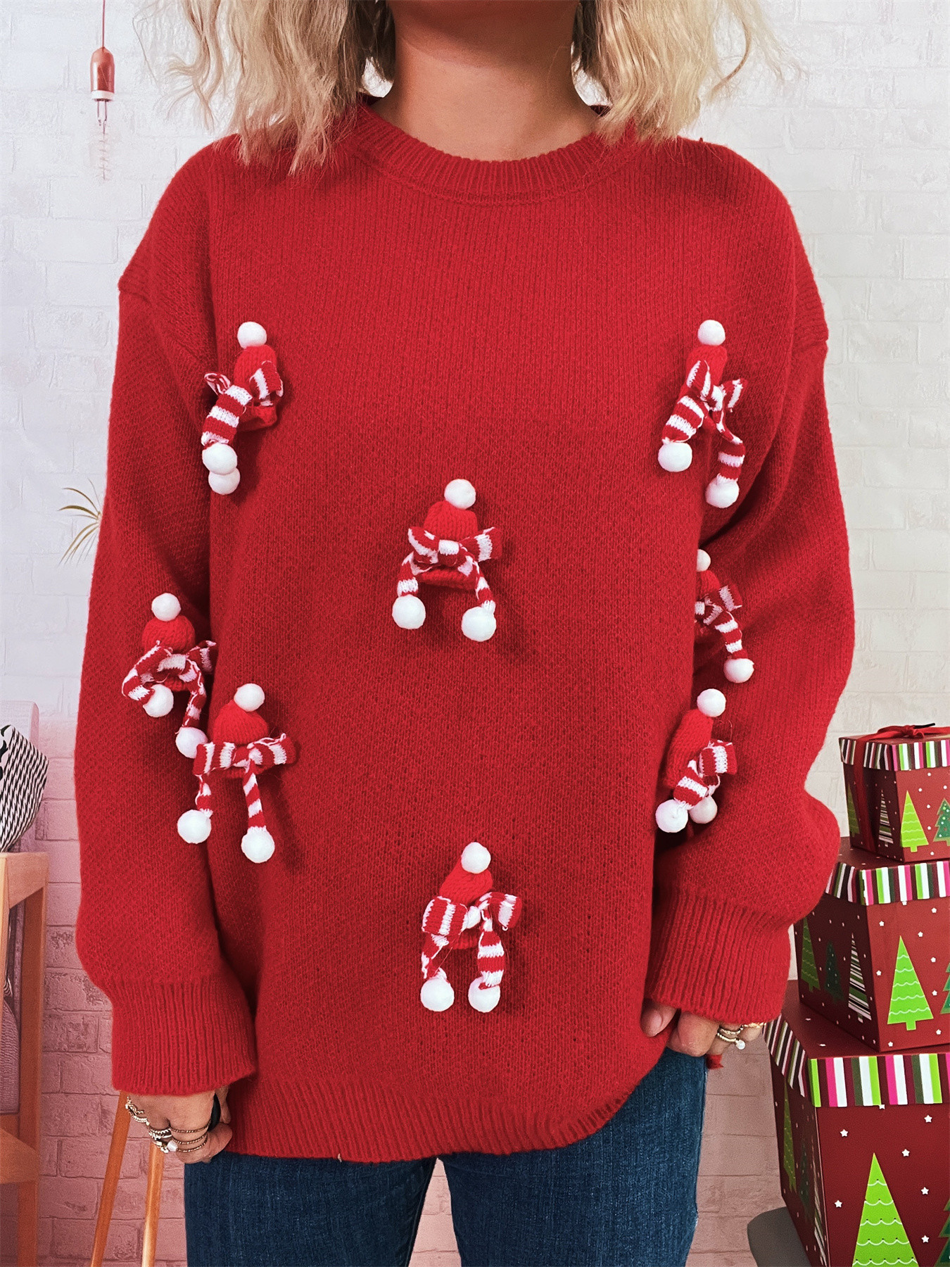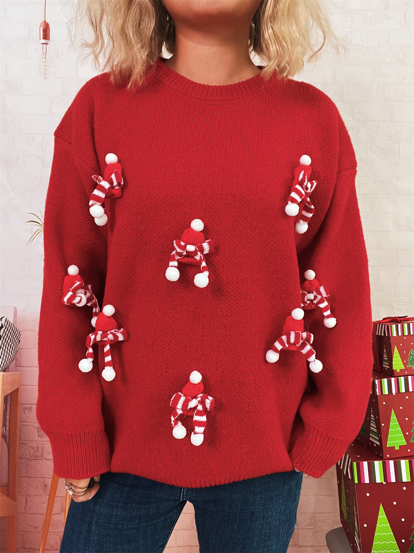 Autumn Winter Christmas Patchwork Bow Sweater Crew Neck Casual