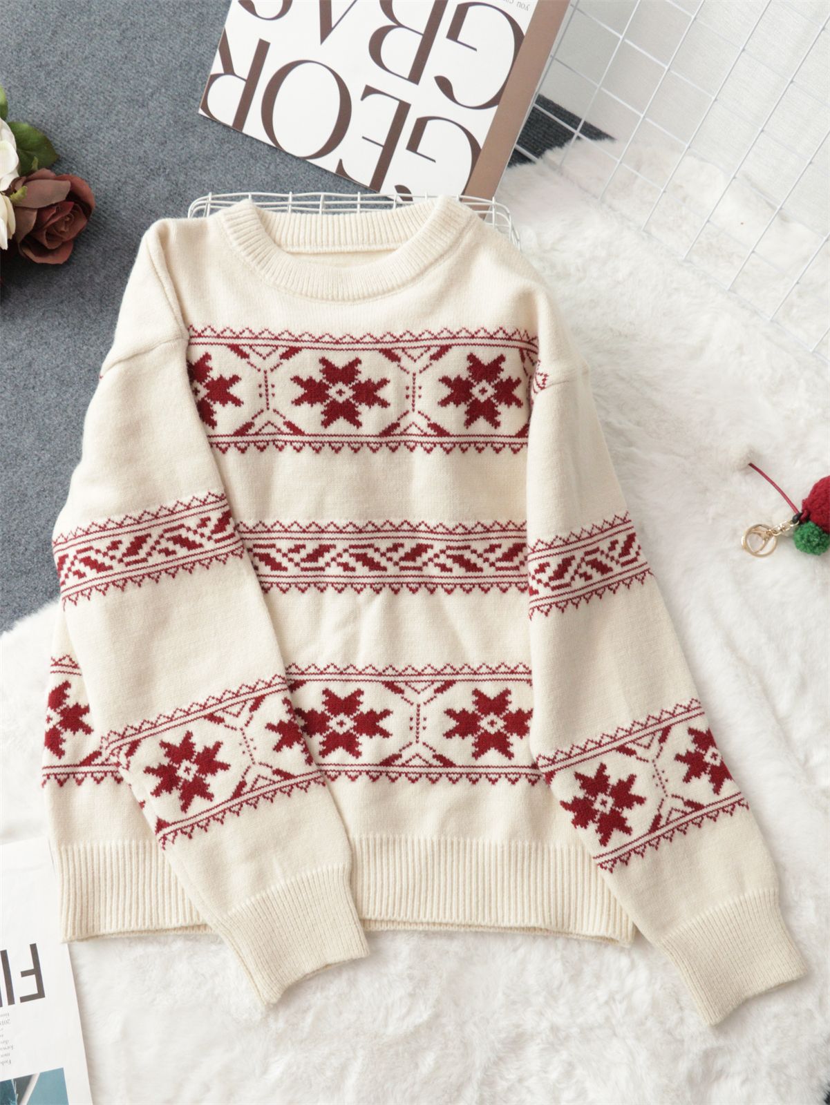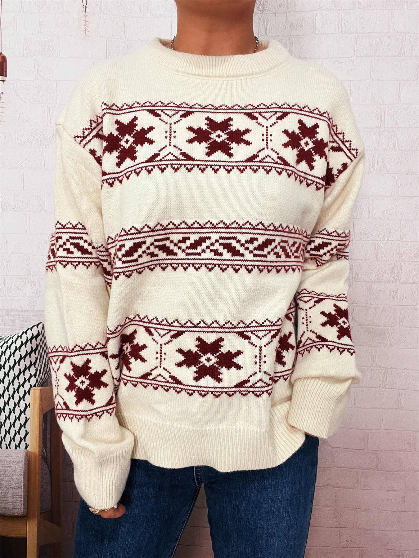 Autumn Winter Holiday Christmas Sweater Snowflake Jacquard Contrast Color round Neck Long Sleeved Knitted Pullover