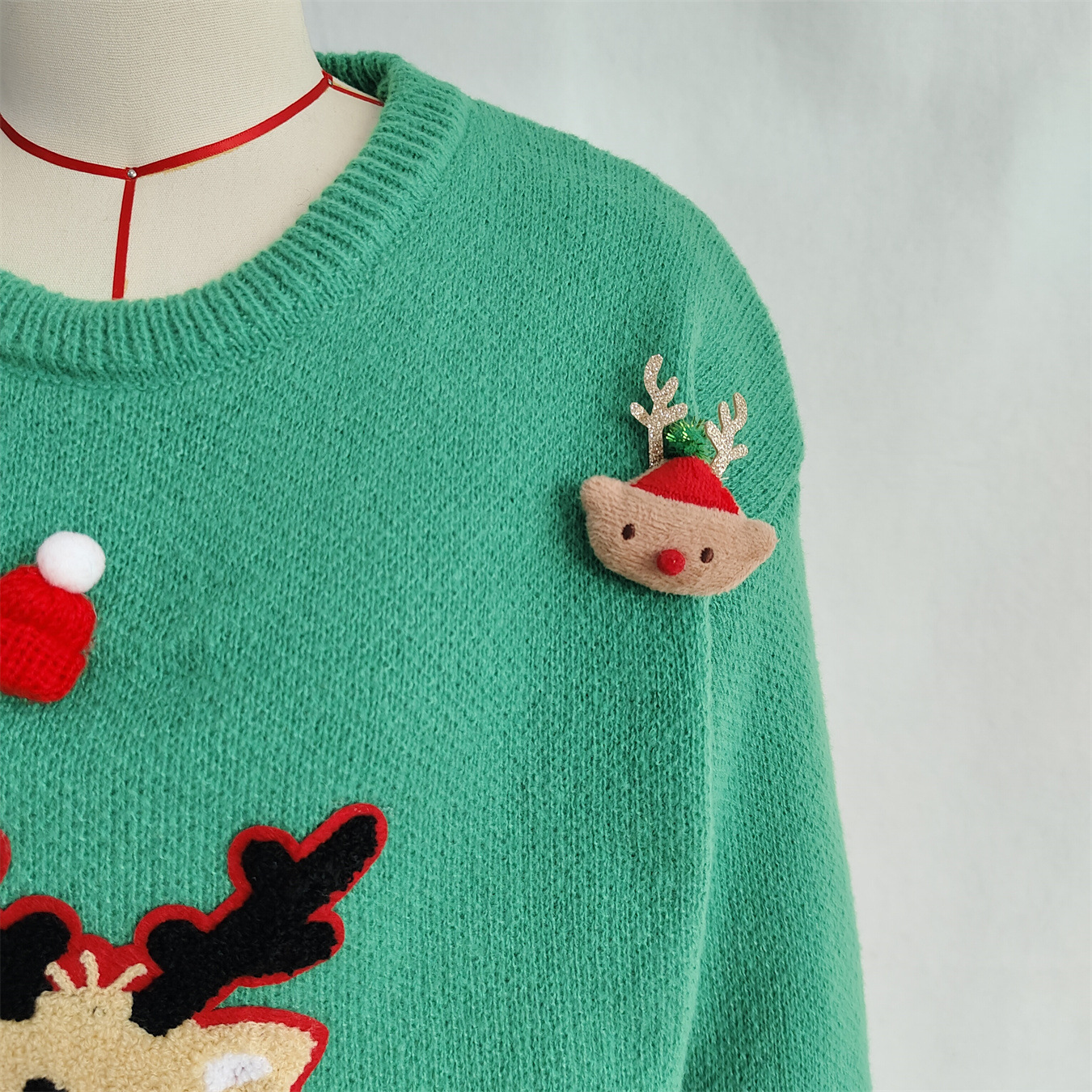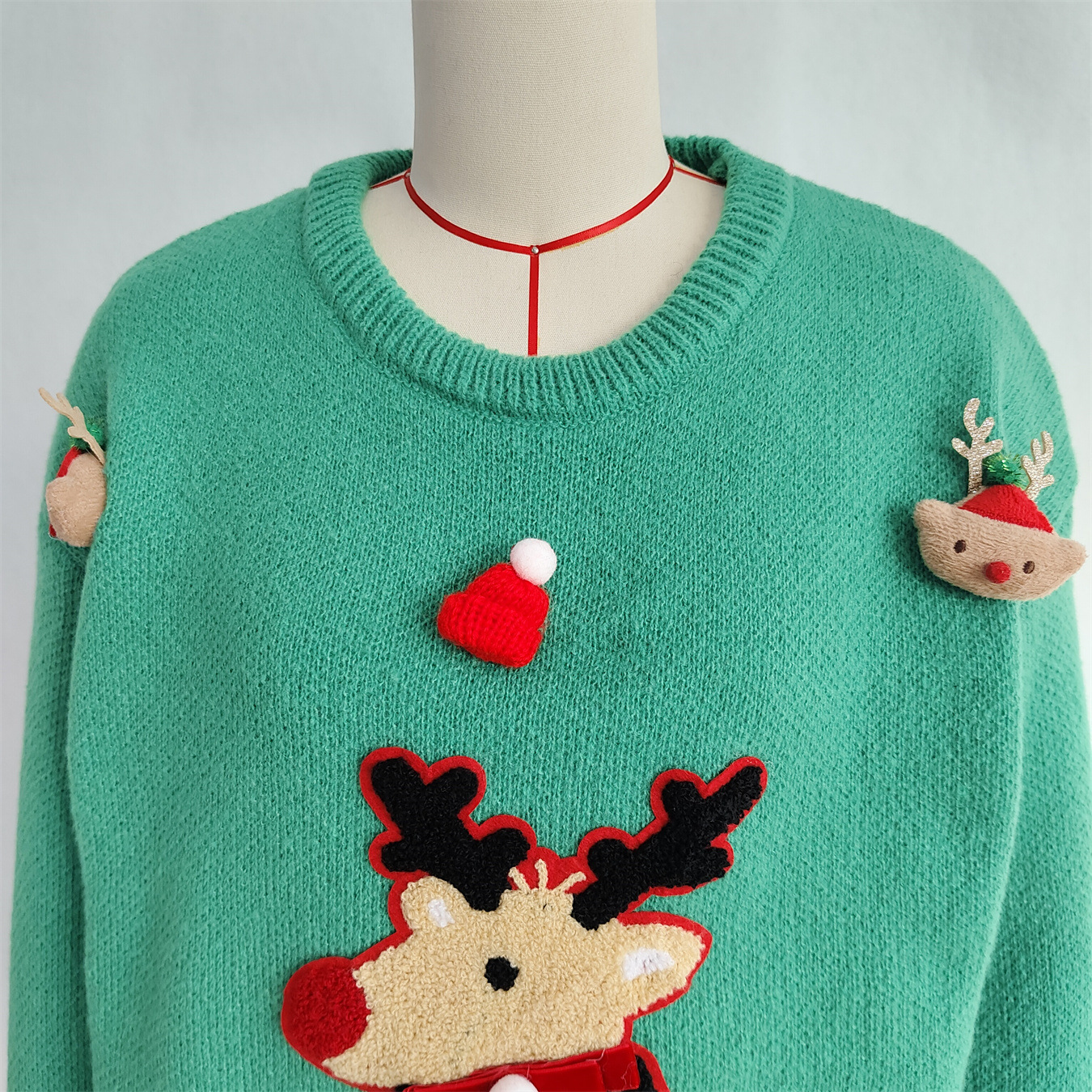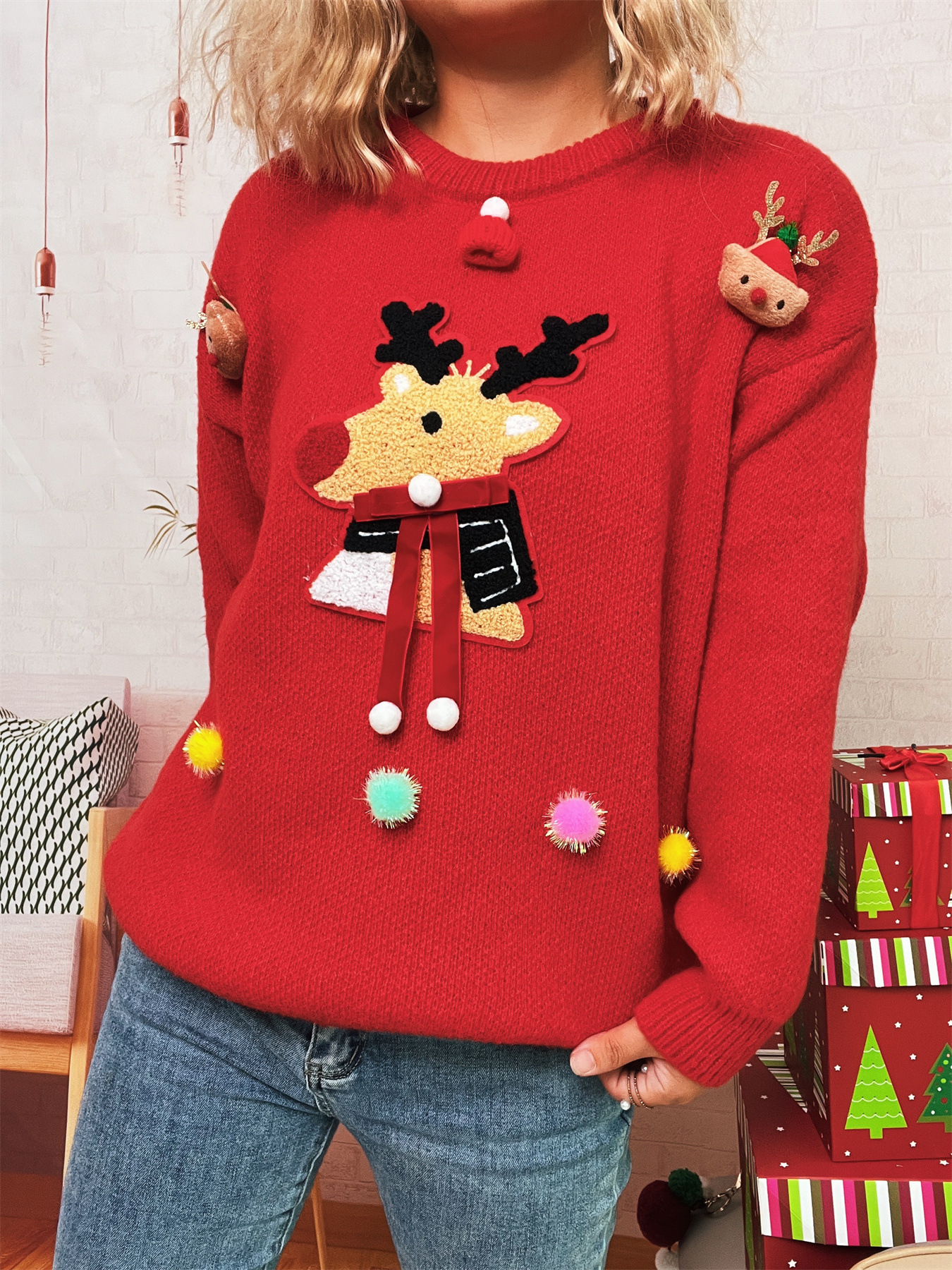 Christmas Patchwork Cartoon Deer Knitted Pullover round Neck Chic Sweater Women