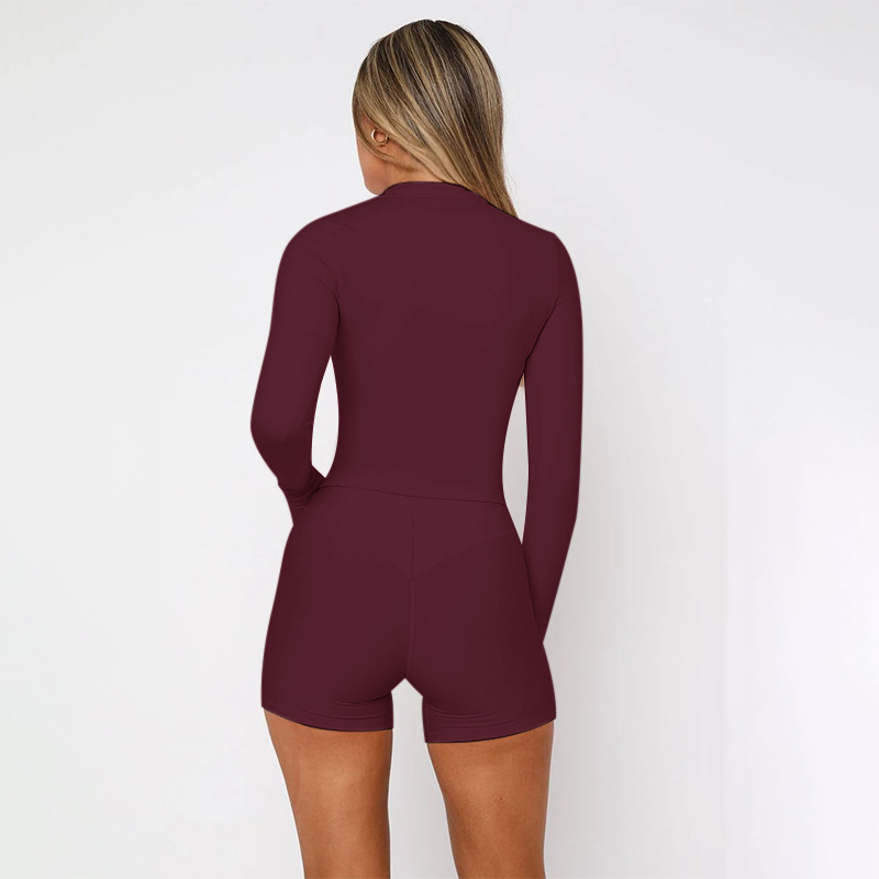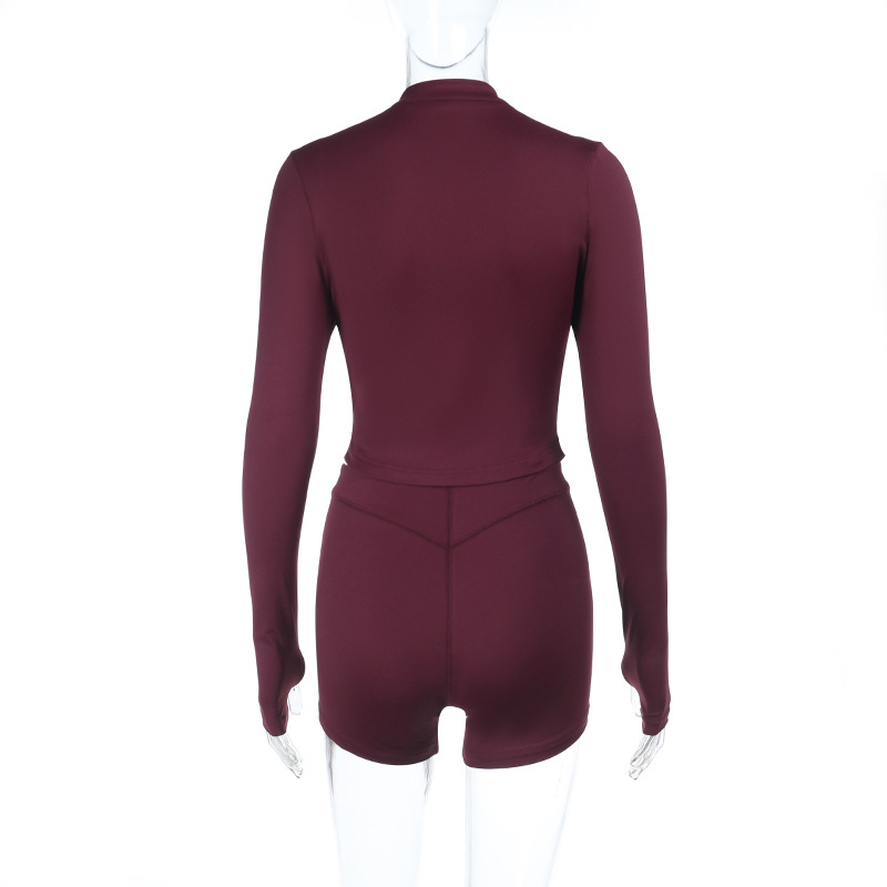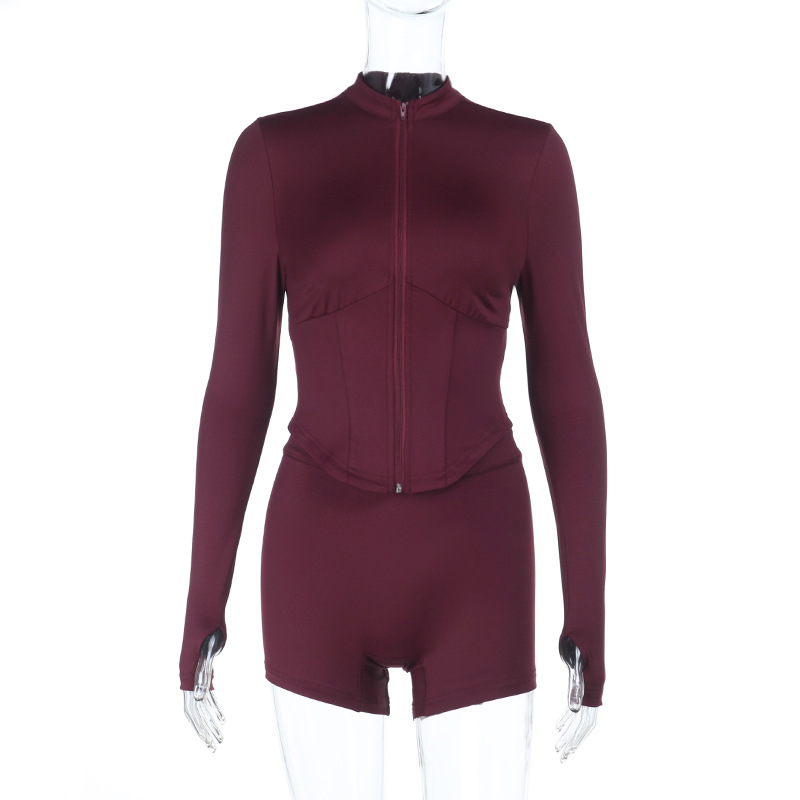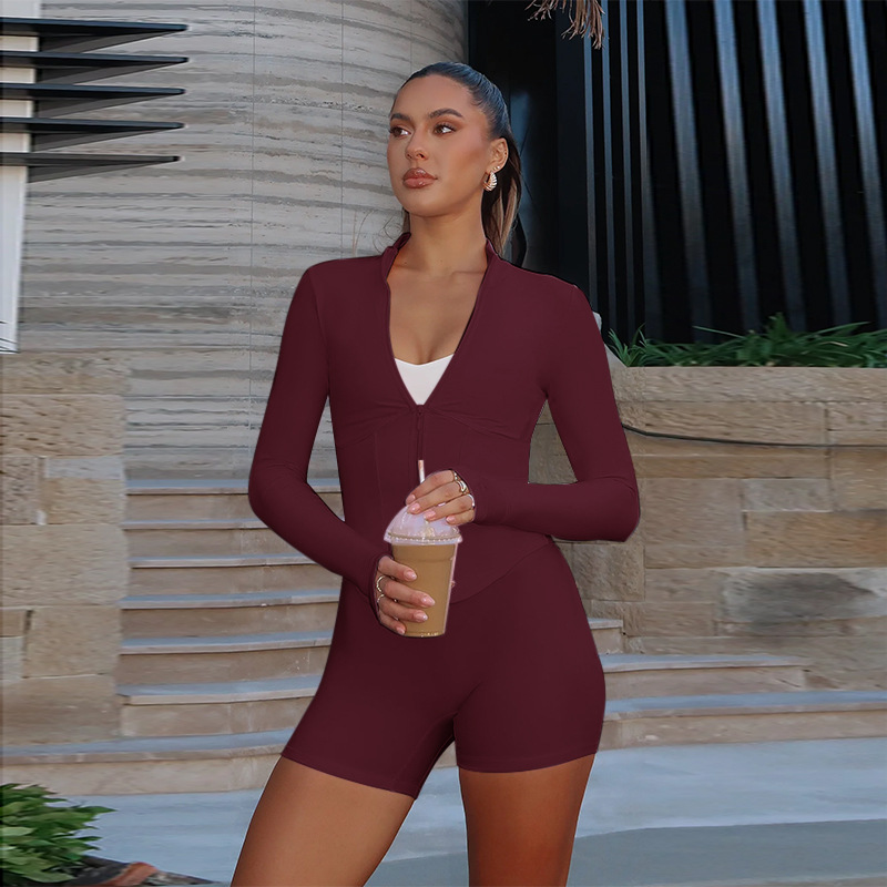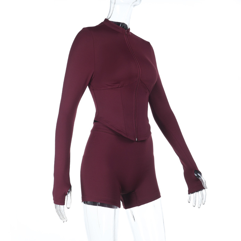 Deep V Plunge Long Sleeve Zipper Top Sexy Peach Hip Tight Shorts Yoga Two Piece Sets Women