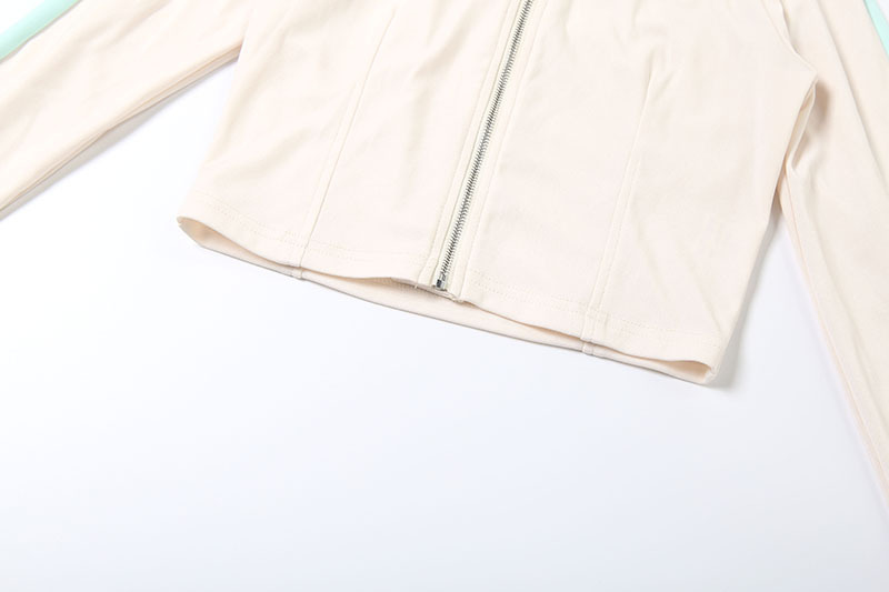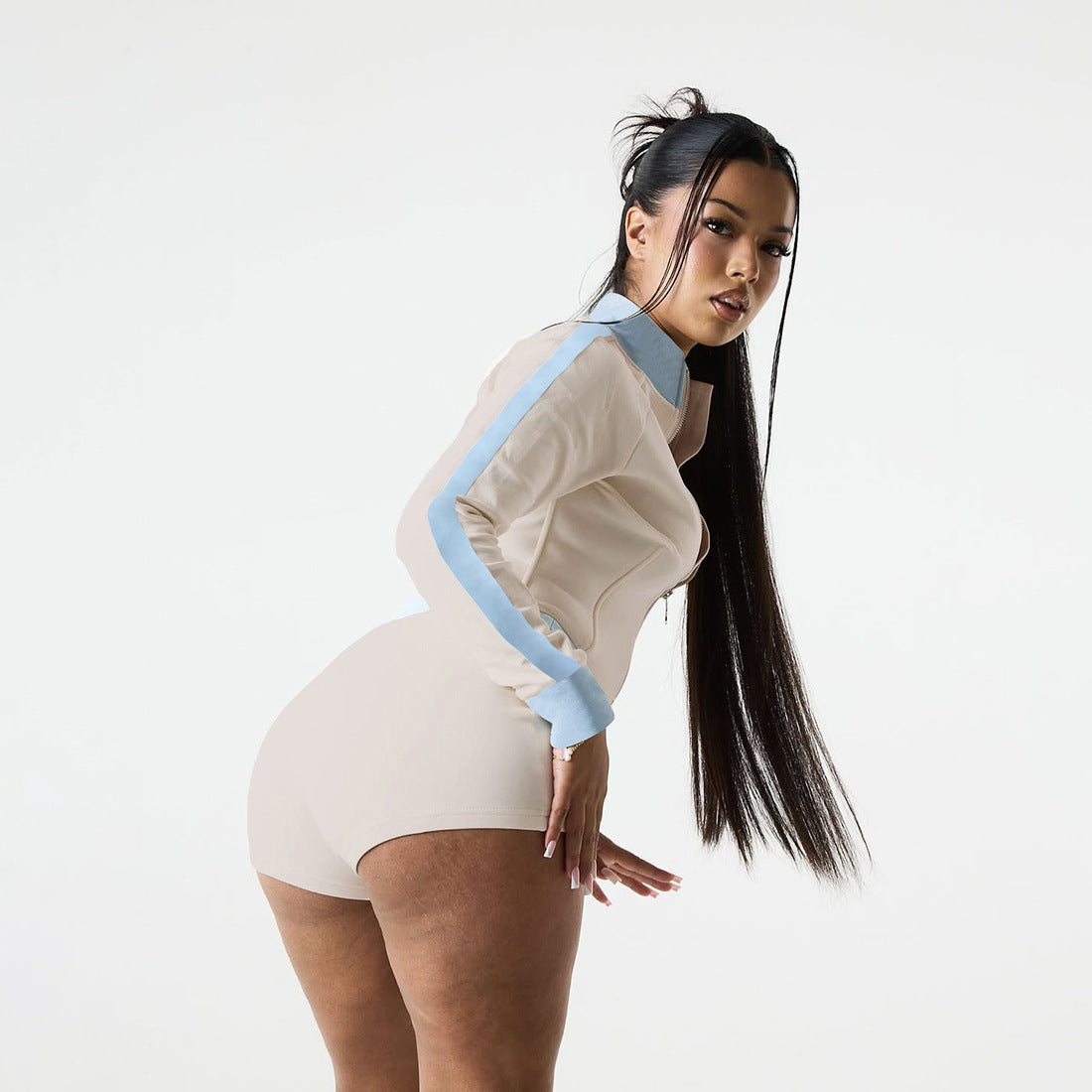 Fall Women Clothing Long Sleeve Stand Collar Color Contrast Zipper Embroidery Sports Shorts Set