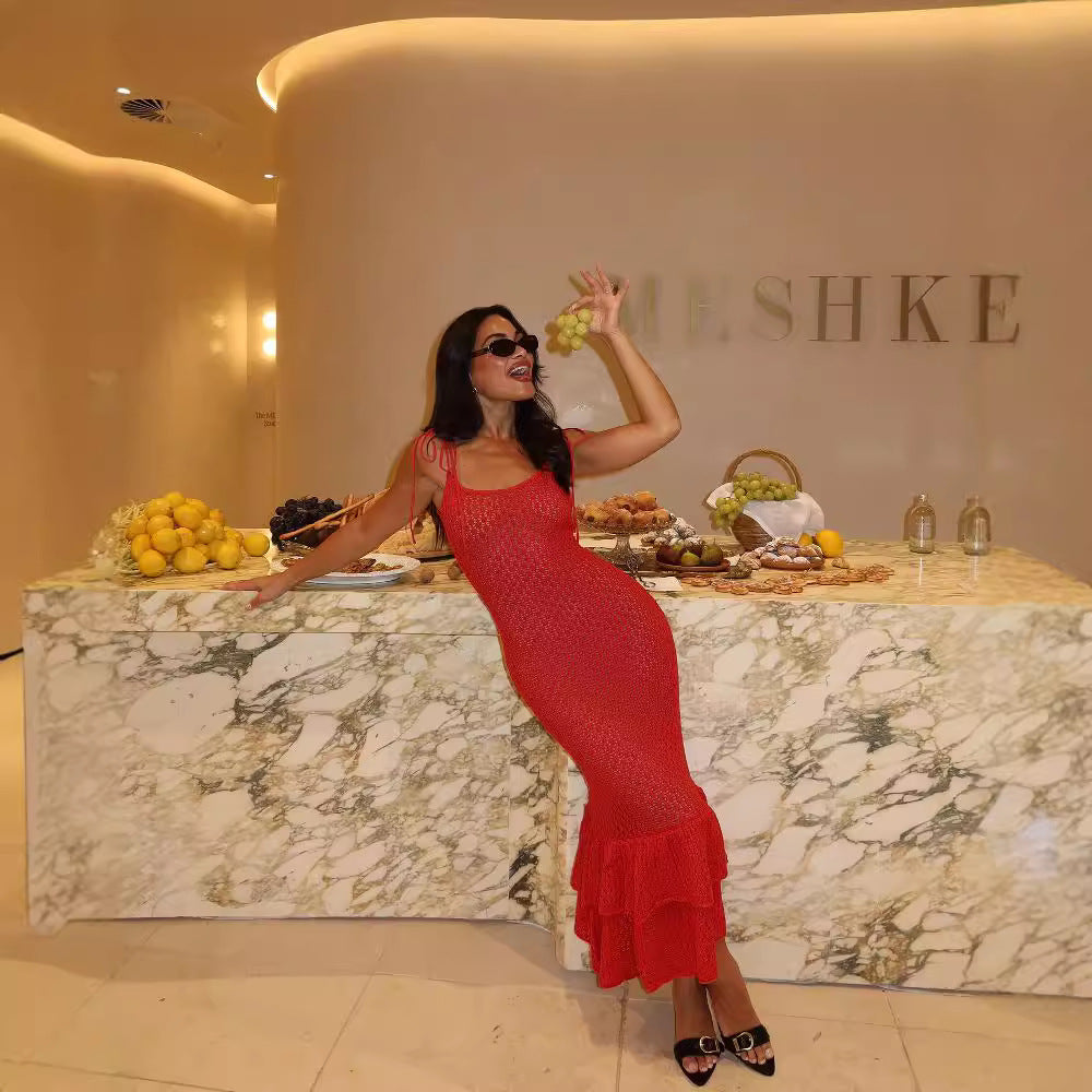 Hollow Out Cutout out Camisole Women Sexy Bohemian Beach Wooden Ear Knitted Sling Tiered Ruffle Maxi Dress Women