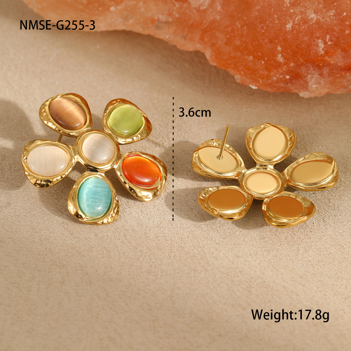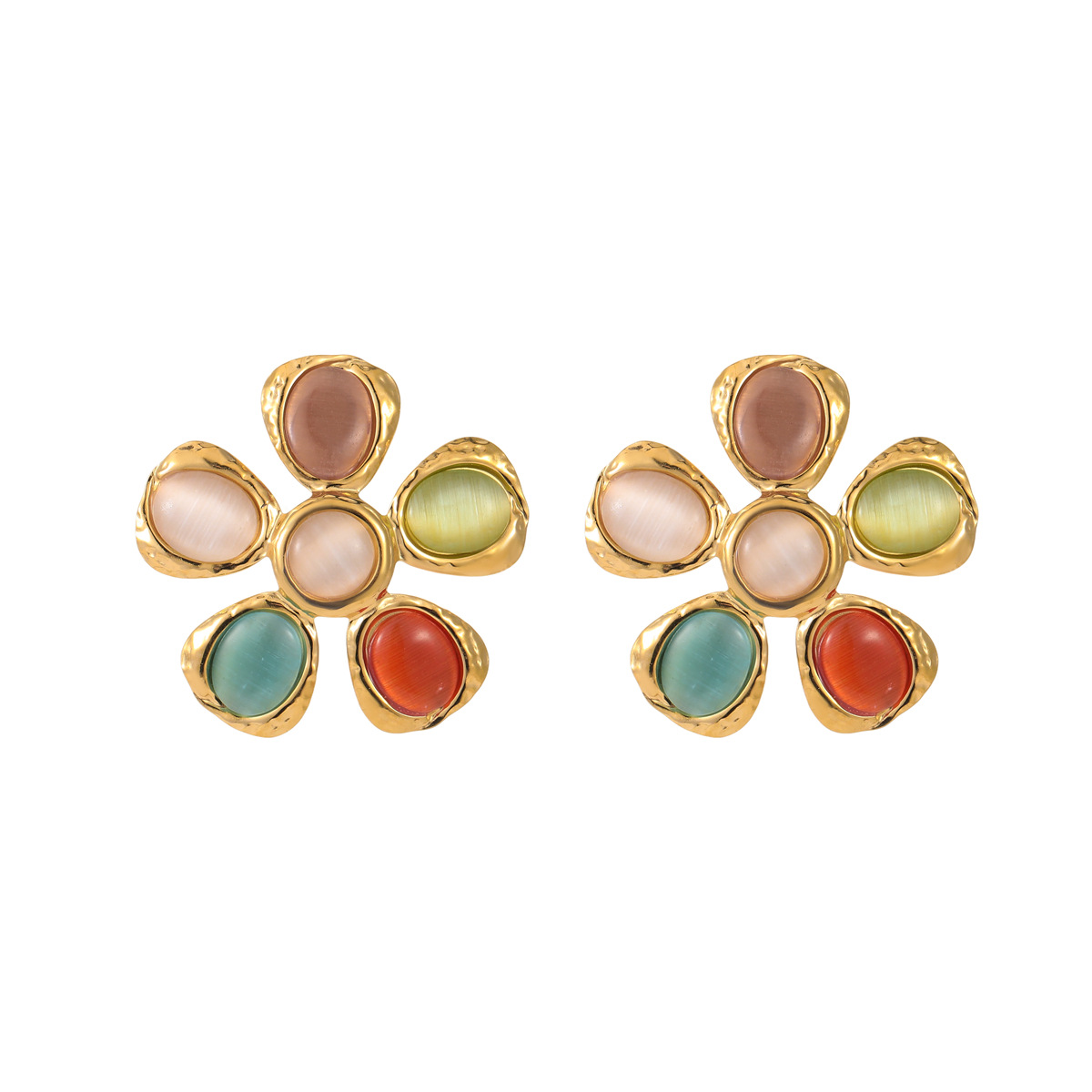 Retro 18K Gold Stainless Steel High Grade Color Opal Hammered Floral Earrings Earrings