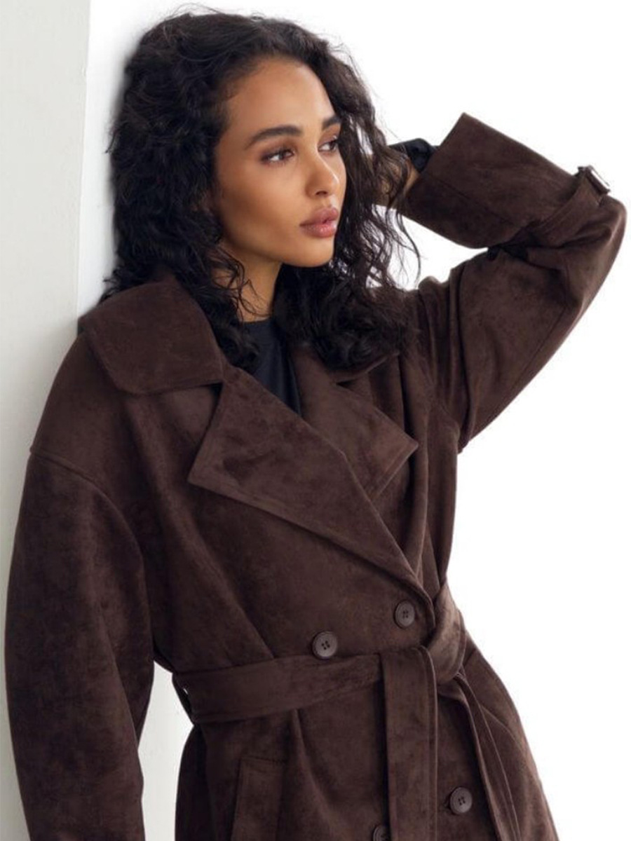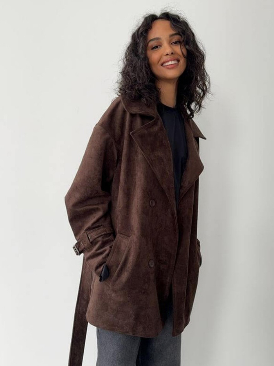 Retro Suede Fabric Jacket Coat Autumn Winter Polo Collar Lace up Waist Trimming Coat