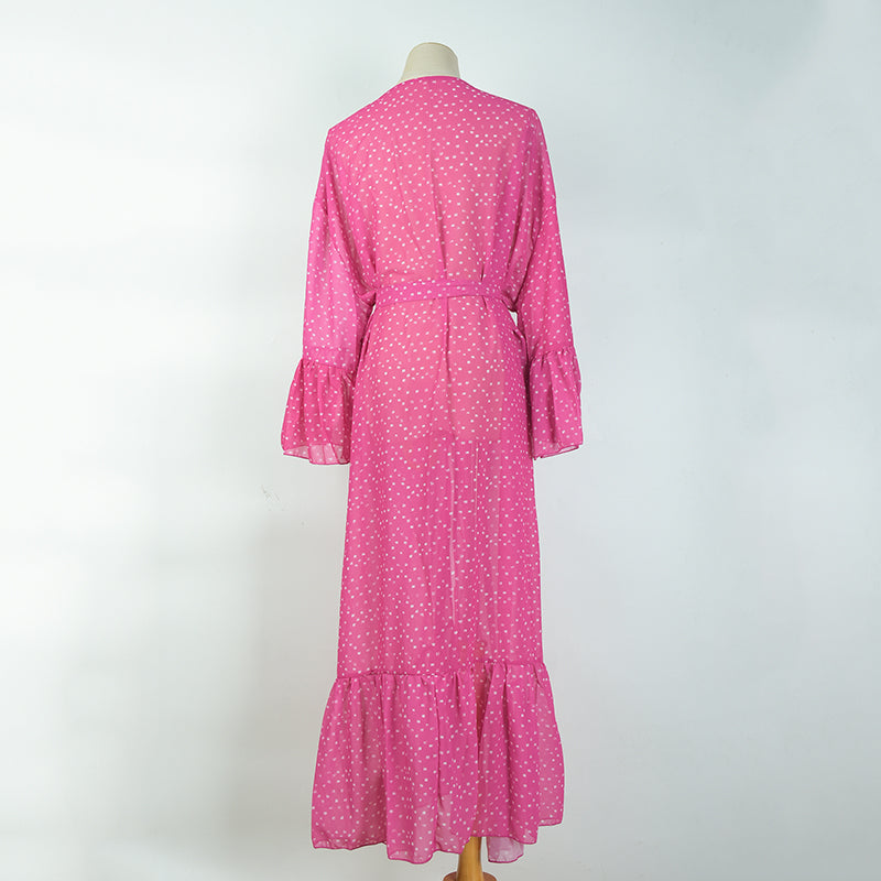 Rose Red White Dot Mid-Length Chiffon Cardigan Beach Jacket Swimsuit Outwear Bikini Sun Protective Blouse