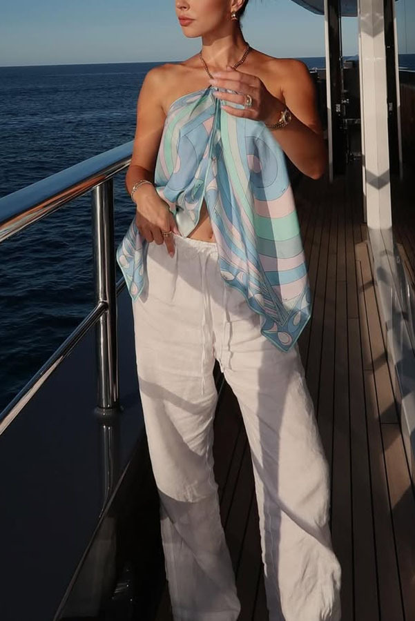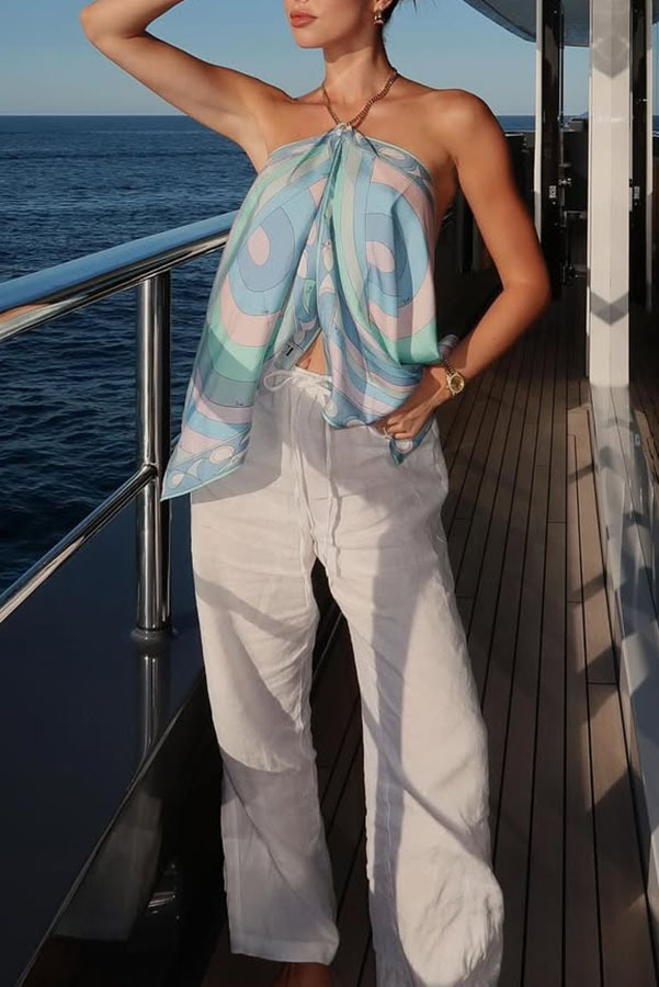 Spring Summer Halter Positioning Printing Tube Top Loose Vacation Party Backless Satin