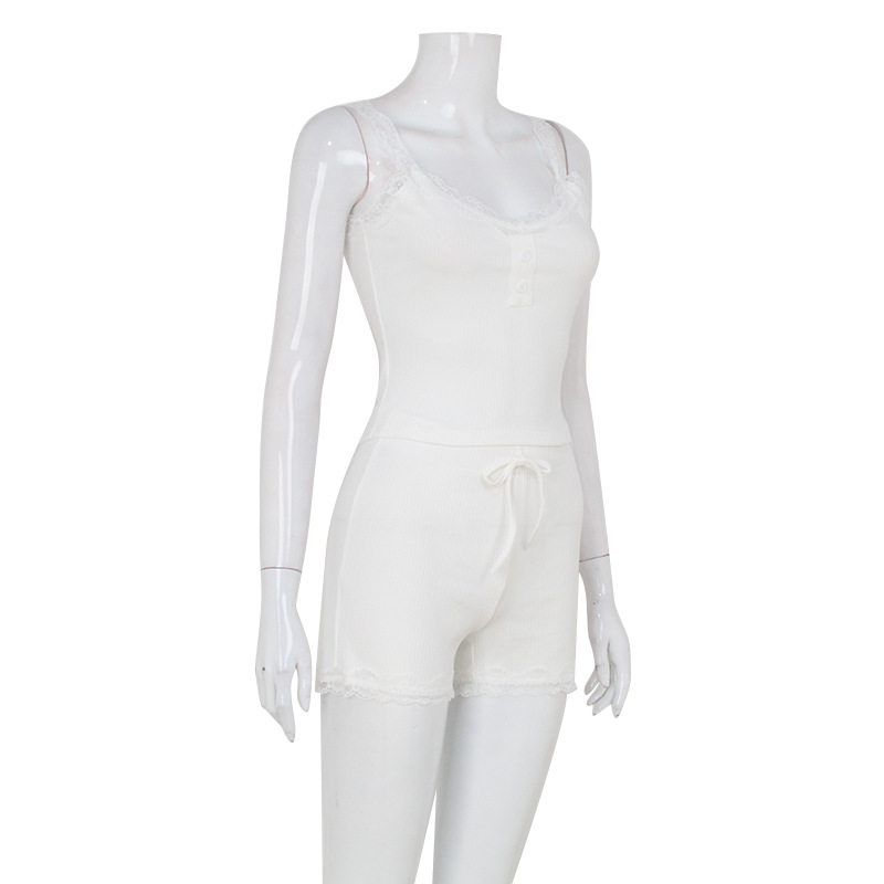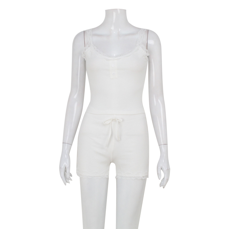 Summer Women Clothing Lace Top with Narrow Straps Shorts Casual Simple Sexy Two Piece Sets