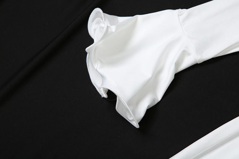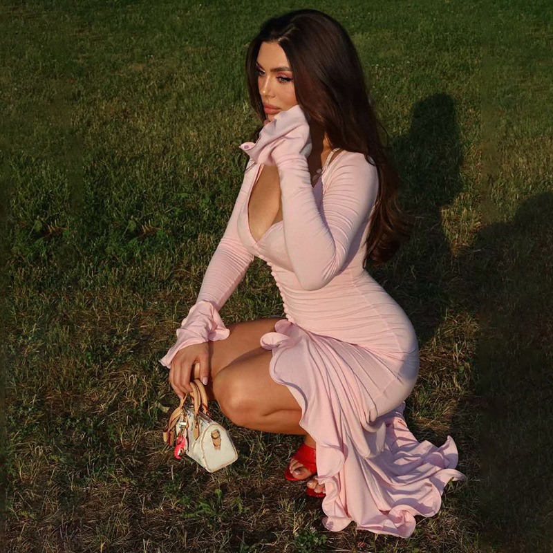 Summer Women Clothing Sexy Slim Solid Color Long Sleeve V neck Flounce Split Dress
