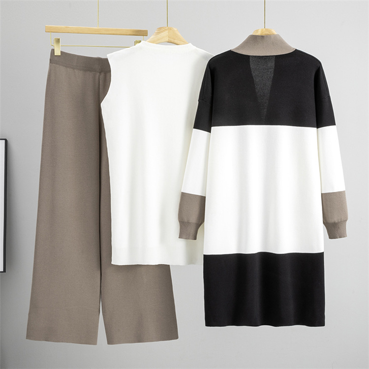 Women Autumn Winter Knitting V neck Cardigan Bottoming Vest Wide Leg Pants Three Piece Set