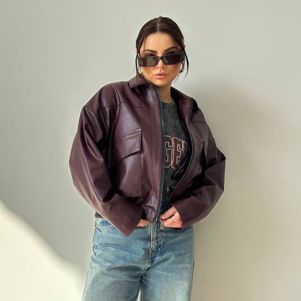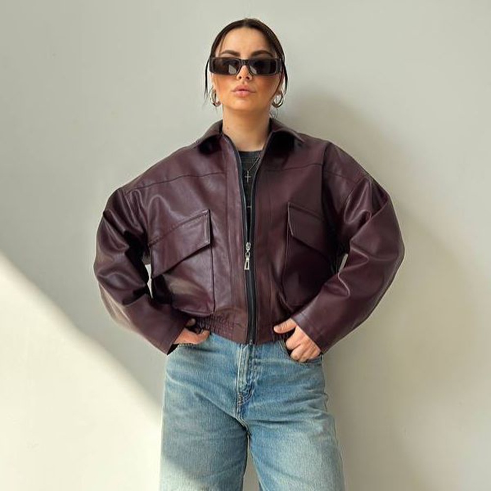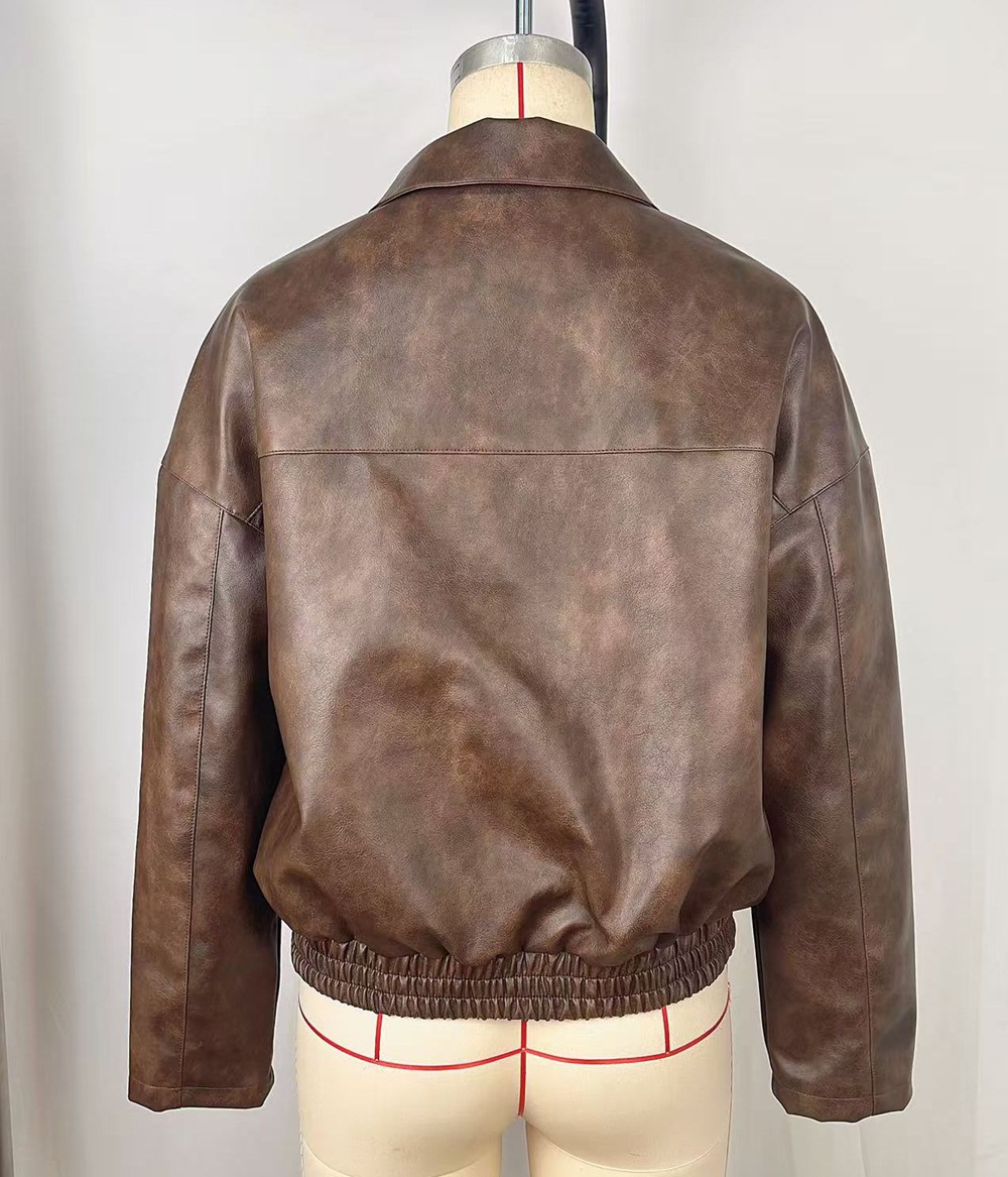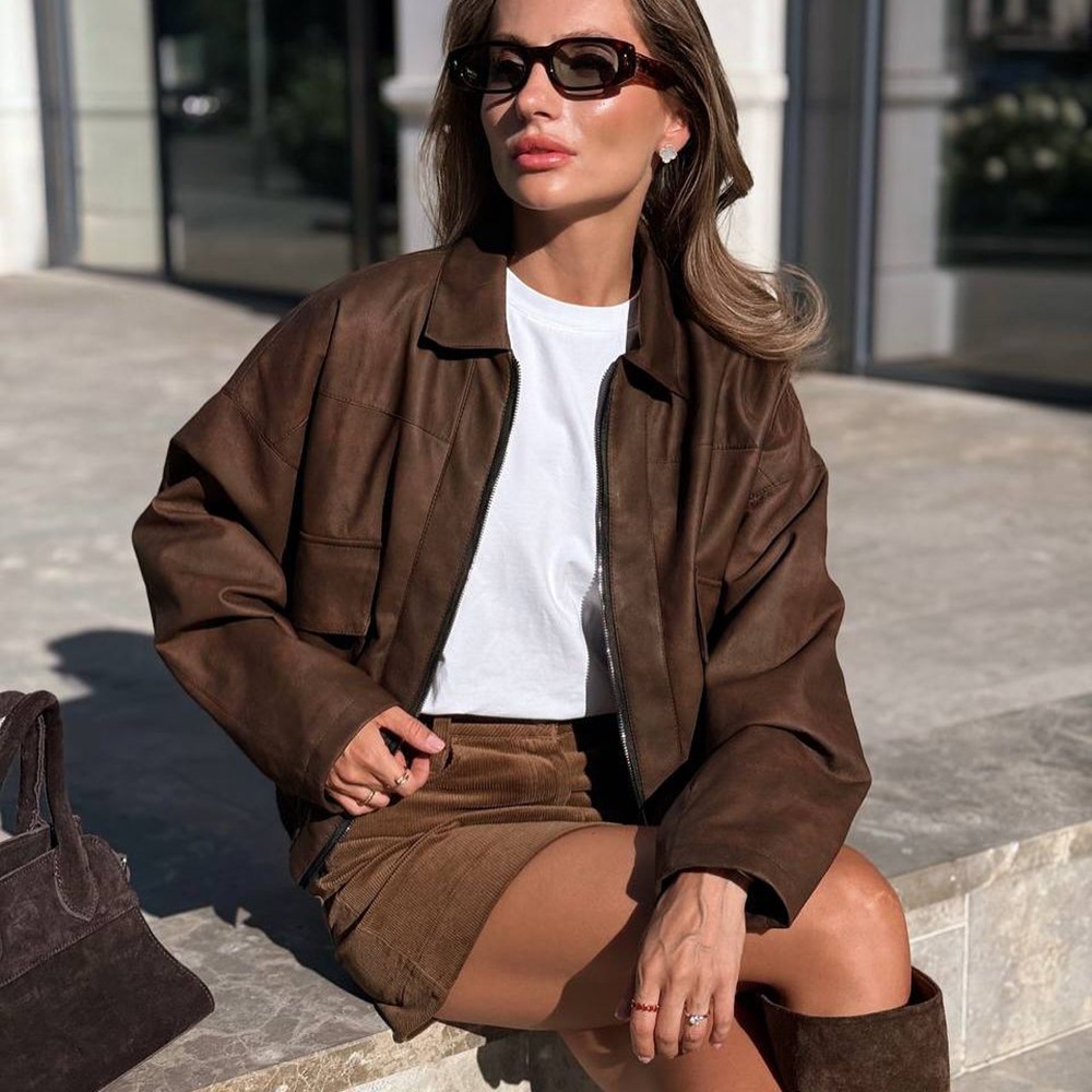 Women Clothing Autumn Winter Coat Bomber Jacket Retro Old Money Leather Motorcycle