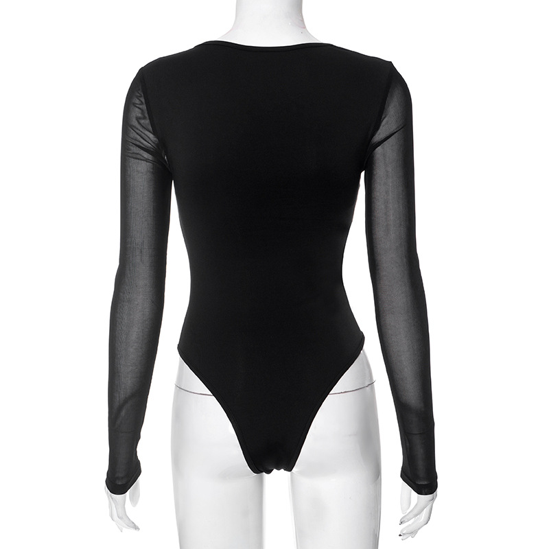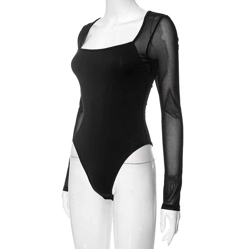 Women Clothing Autumn Winter Square Collar Long Sleeve Mesh Slim Fit Patchwork Jumpsuit