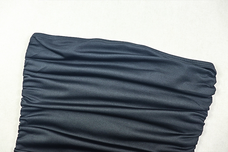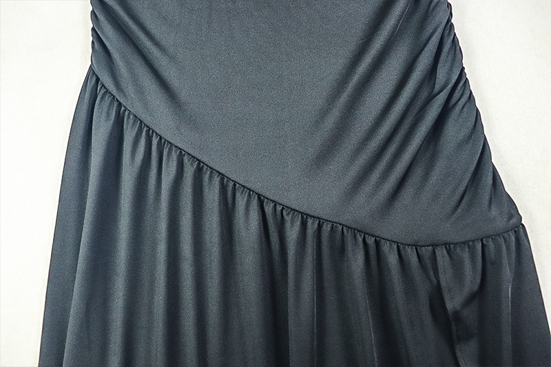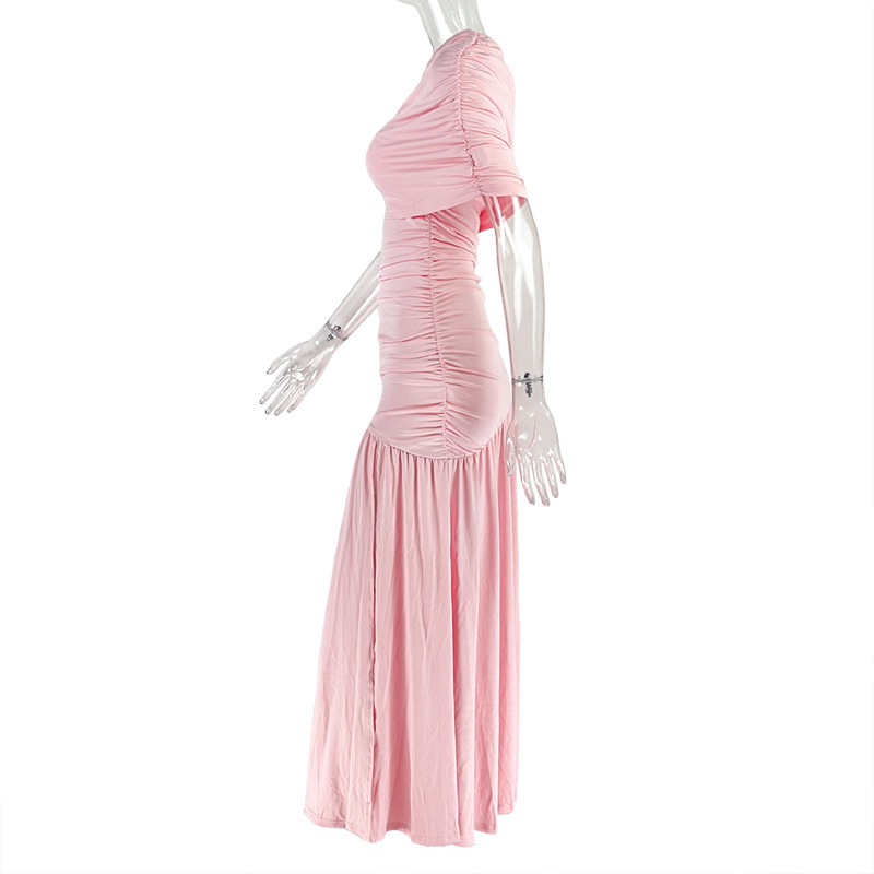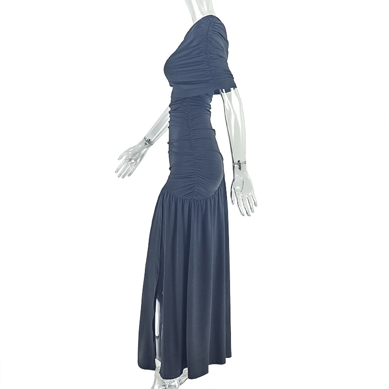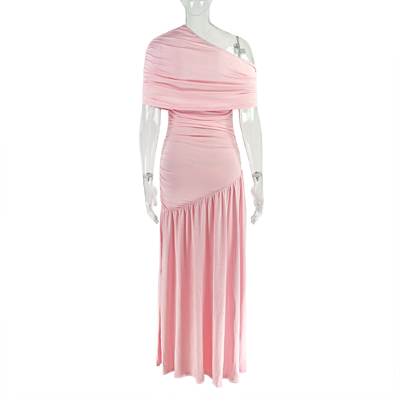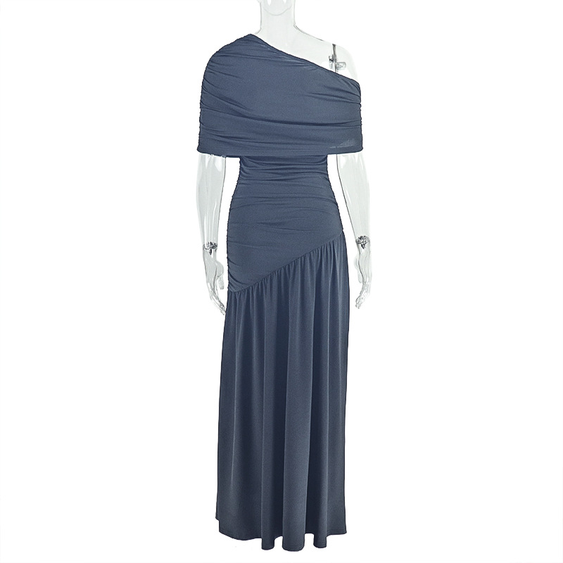 Women Clothing Special Split Casual Asymmetric One Shoulder Diagonal Collar Long Solid Color Dress