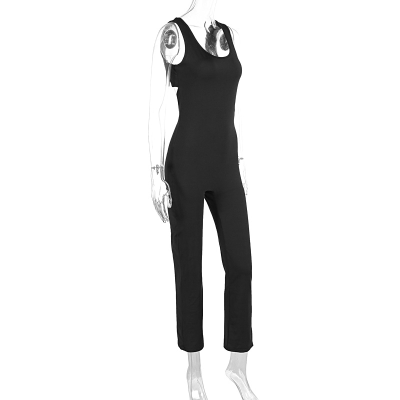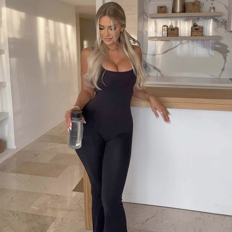 Women Clothing Summer Solid Color Sling Backless Hip Raise Skinny Sports Jumpsuit
