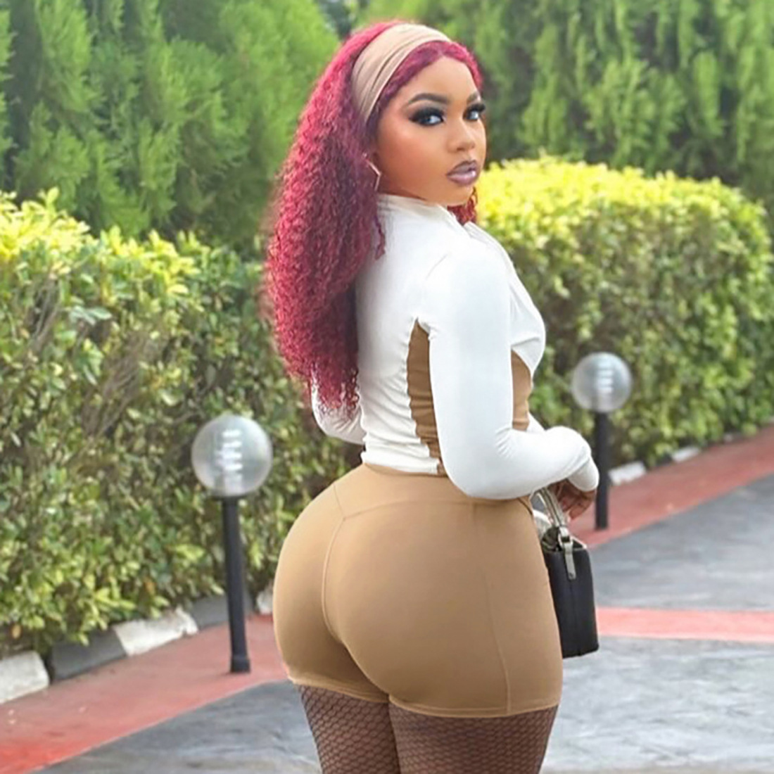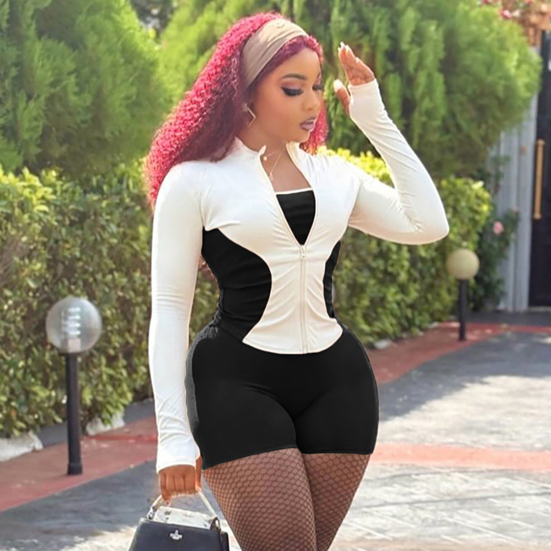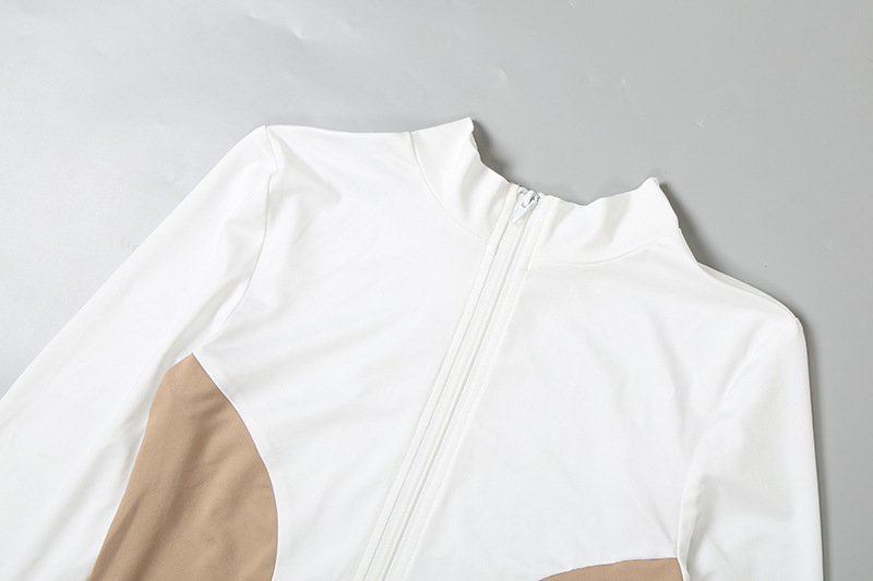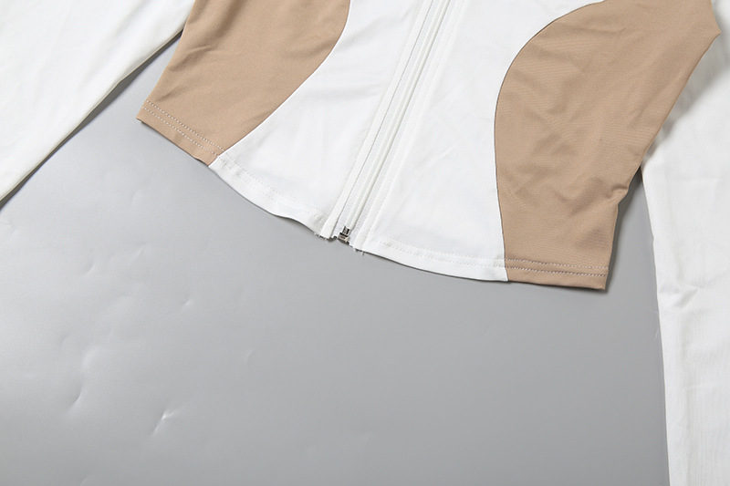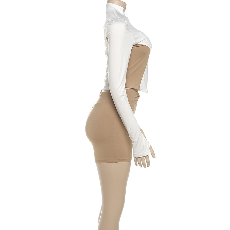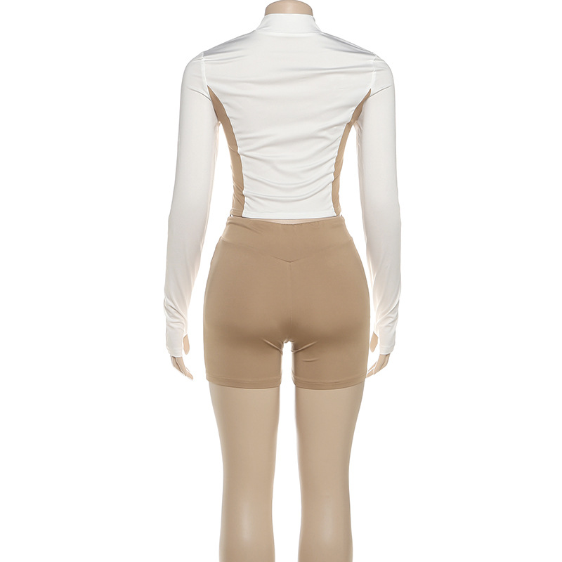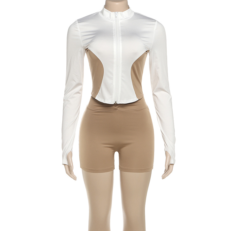 Women Stand Collar Zipper Sleeve Top Contrast Color Sports Shorts Two Piece Sets
