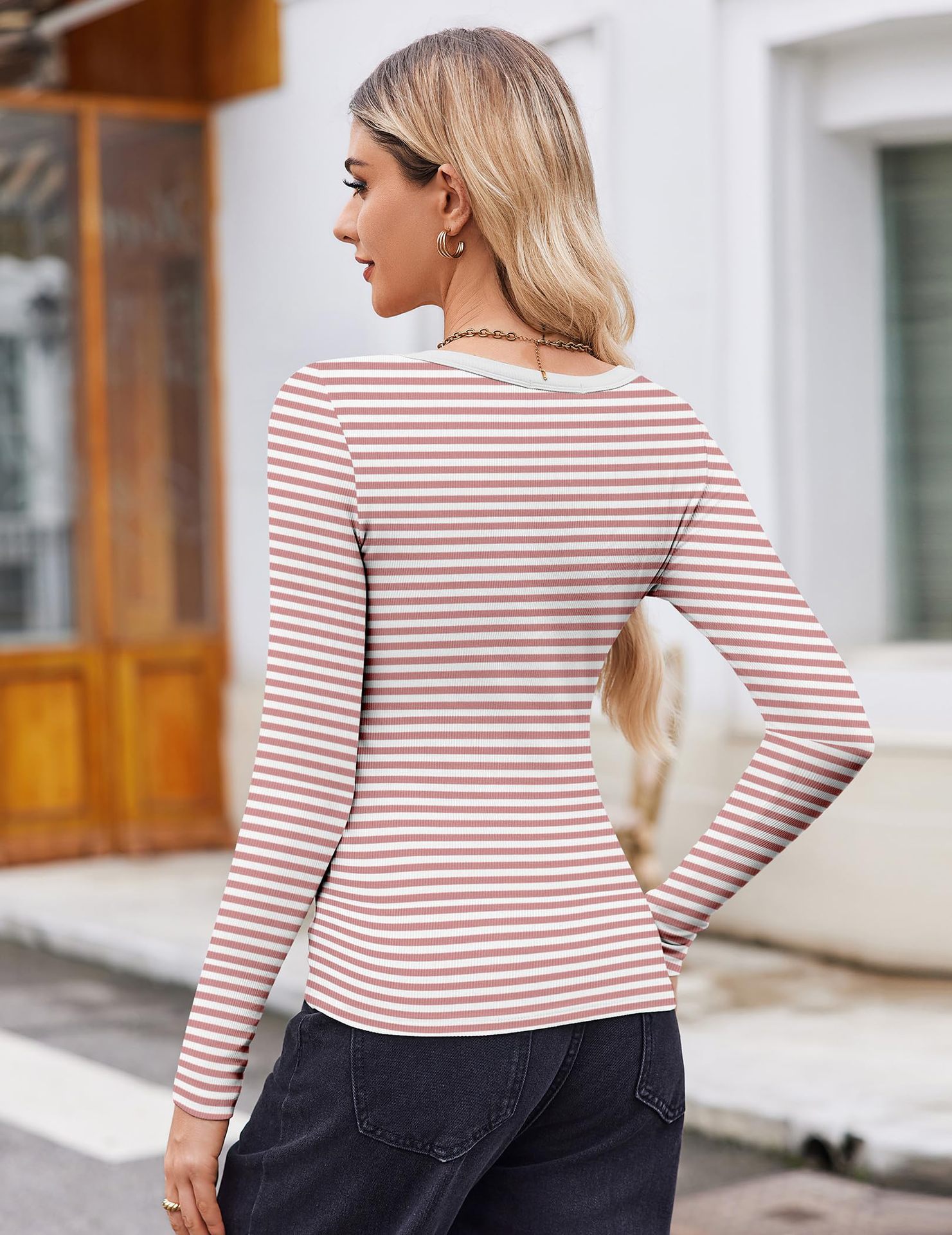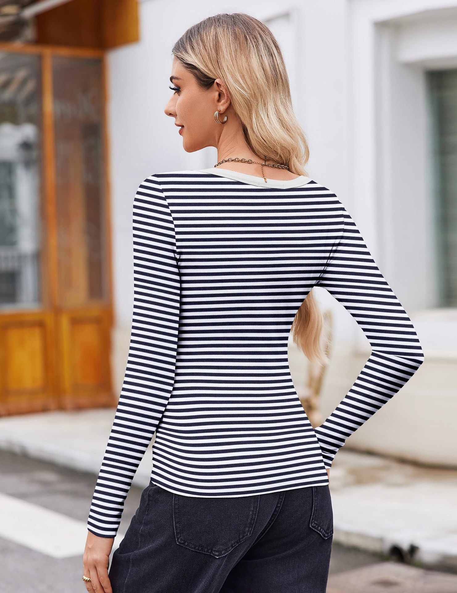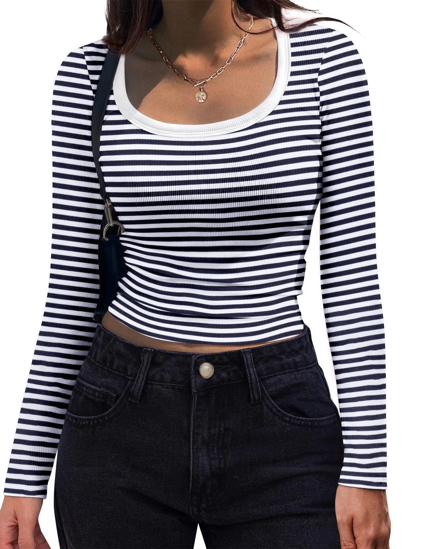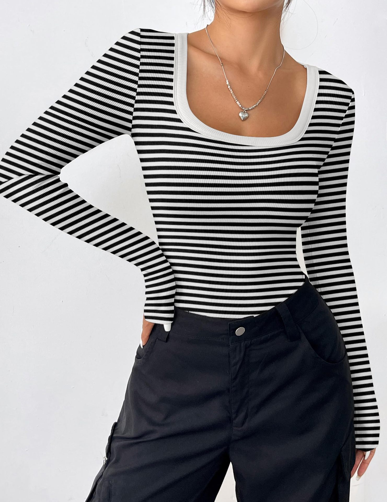 Women Wear Top Striped Slim U Neck Sexy Long Sleeve