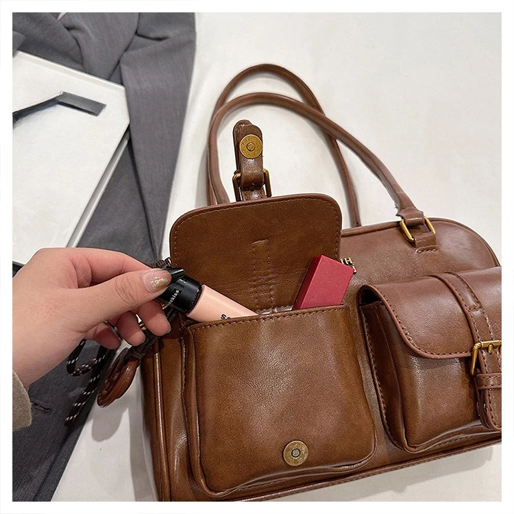 Women's Retro Solid Color Pu Leather Shoulder Bag with Multiple Pockets Large Capacity Comes with A Detachable Accessory Charm